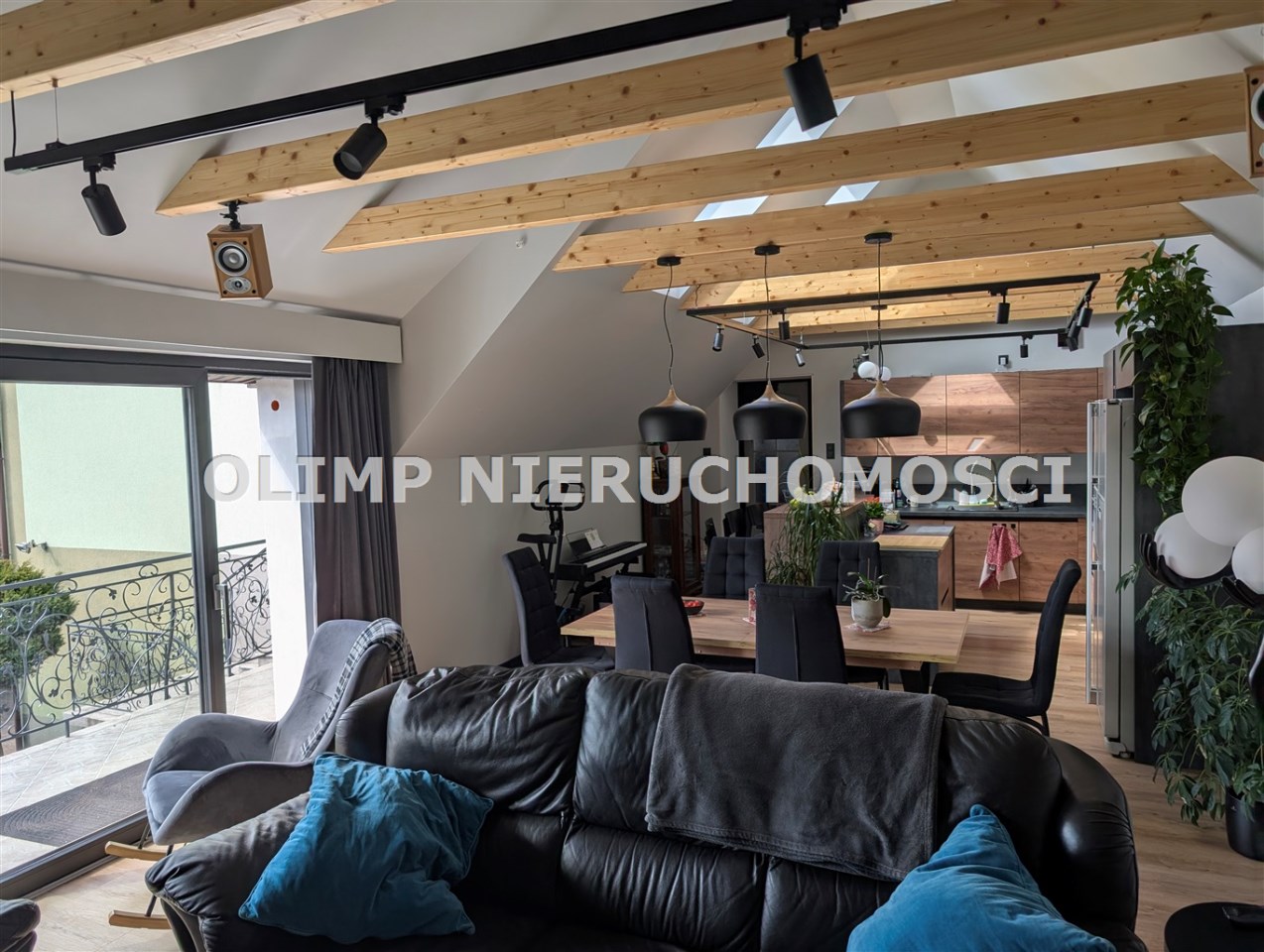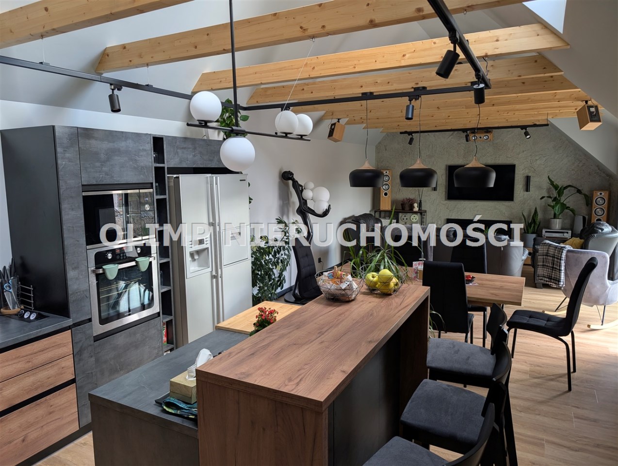 Na 1 piętrze salon z otwartą kuchnią i wyjściem na taras, dwie sypialnie i stara kuchnia. Powierzchnia łącznie 110,65 m2.