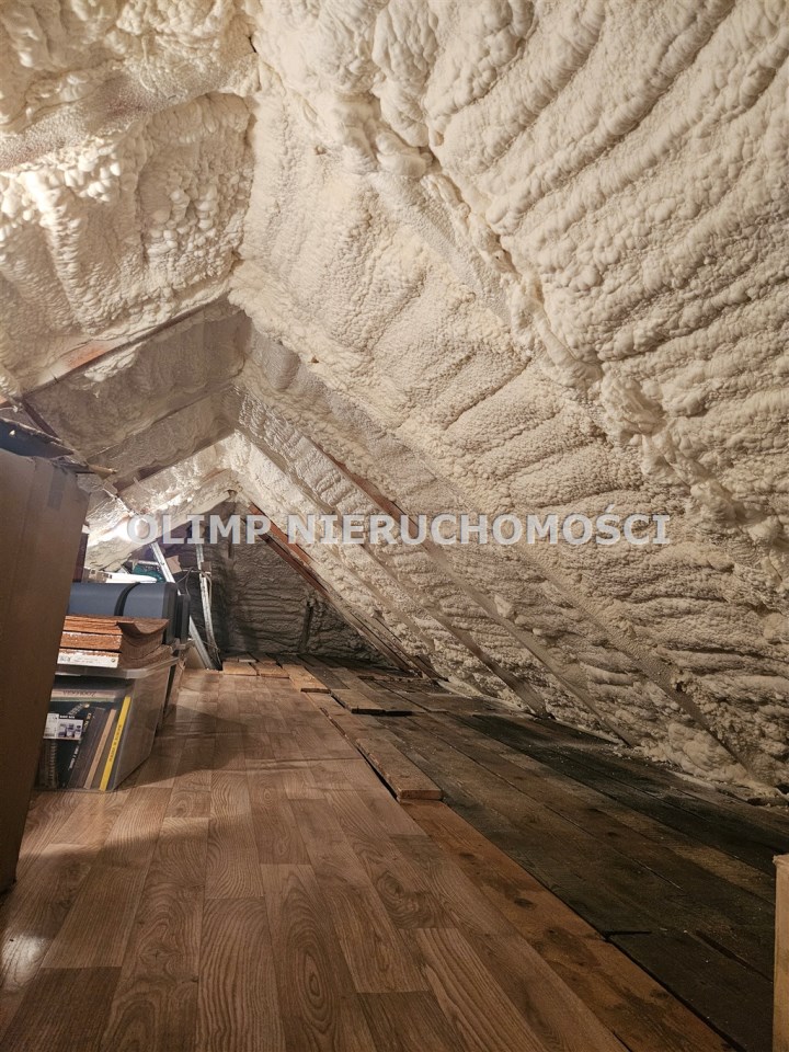 Dach kryty blachodachówką, docieplony pianką pur, stropy żelbetonowe, fundamenty kamienne, ściany zewnętrzne z cegły.